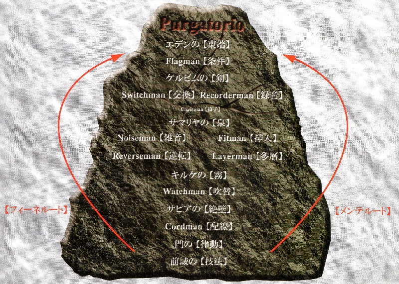 楽園へ続くの東からの道は門で閉ざされており、門の前には燃え盛る天使の剣が道を塞いでいる。天使とは、「主」の命を愚直に守るシステムの事といえる。この門を突破しようとする者の前には、「天使」という防御システムが立ちはだかる。
